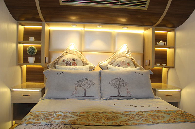 整车布局 车辆中部是大客厅,右侧是带拓展仓的L形真皮沙发,舒适美观,尽显奢华,沙发可容纳5人左右同时落座。 在房车前后部装有两台美的变频冷暖空调,便于分块调节卧室与客厅的温度。